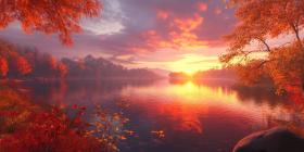 Autumnal Blaze: A fiery sunset paints the sky and reflects on the placid waters of a lake, illuminating the vibrant foliage of the surrounding autumnal landscape.