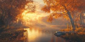 Autumnal Blaze: A fiery sunset paints the sky and reflects on the placid waters of a lake, illuminating the vibrant foliage of the surrounding autumnal landscape.
