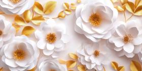Elegant Floral Design with White Paper Flowers and Gold Leaves on a Soft White Background for Wedding Invitations, Greeting Cards, and Decorative Art