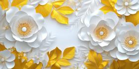 Elegant Floral Design with White Paper Flowers and Gold Leaves on a Soft White Background for Wedding Invitations, Greeting Cards, and Decorative Art