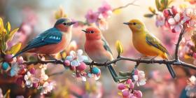 Colorful Finches in Spring Bloom, Perched Birds, Vibrant Plumage, Cherry Blossoms, Whimsical Scene, Nature's Palette, Birdwatching Delight