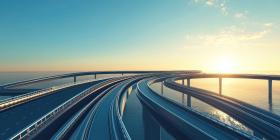 Elevated Highway Curves Over Water at Sunset, Modern Infrastructure and Scenic Ocean View
