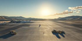 Airplane on Runway at Sunset with Mountains and Golden Light, Aerial View of Airport