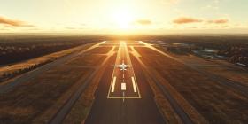 Airplane on a Runway Surrounded by Forest and Lakes, Aerial View at Sunrise