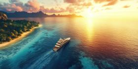 Luxury Yacht Anchored off a Tropical Island at Sunset, Tranquil Ocean Paradise