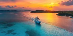 Luxury Yacht Anchored off a Tropical Island at Sunset, Tranquil Ocean Paradise