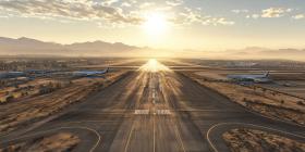 Airplane on Runway at Sunset with Mountains and Golden Light, Aerial View of Airport