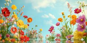 Wildflower Meadow Under Blue Sky, Colorful Blossoms, Poppies and Buttercups, Natural Beauty, Sunny Day, Floral Landscape, Springtime Scene, Outdoor Delight