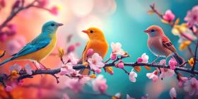 Colorful Finches in Spring Bloom, Perched Birds, Vibrant Plumage, Cherry Blossoms, Whimsical Scene, Nature's Palette, Birdwatching Delight