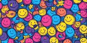 Colorful Smiley Faces Pattern, Happy Emoticons, Cheerful Background, Playful Design, Cartoon Faces, Vibrant Colors, Joyful Illustration, Whimsical Art