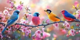 Colorful Finches in Spring Bloom, Perched Birds, Vibrant Plumage, Cherry Blossoms, Whimsical Scene, Nature's Palette, Birdwatching Delight