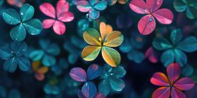 Colorful Oxalis Leaves with Dew Drops, Vibrant Heart-Shaped Foliage, Whimsical Nature, Macro Photography, Botanical Art, Close-up Leaf Detail