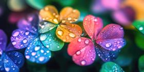 Colorful Oxalis Leaves with Dew Drops, Vibrant Heart-Shaped Foliage, Whimsical Nature, Macro Photography, Botanical Art, Close-up Leaf Detail