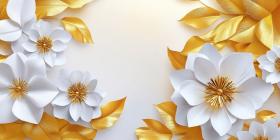 Elegant Floral Design with White Paper Flowers and Gold Leaves on a Soft White Background for Wedding Invitations, Greeting Cards, and Decorative Art