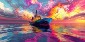 Dreamy Sea Voyage, Pastel Sky and Clouds, Vintage Boat, Calm Waters, Surreal Landscape, Colorful Reflections, Fantasy Travel, Whimsical Journey