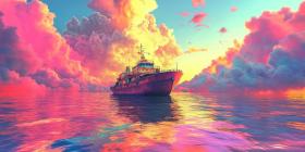 Dreamy Sea Voyage, Pastel Sky and Clouds, Vintage Boat, Calm Waters, Surreal Landscape, Colorful Reflections, Fantasy Travel, Whimsical Journey