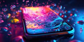 Smartphone with Abstract Neon Lights and Water Droplets on Screen, Futuristic Technology Concept