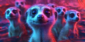 Close-up of a Meerkat Face with Big Eyes, Surrounded by Blurry Meerkats in a Pink Light