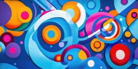 Abstract Art with Vibrant Circles and Shapes in Blue, Orange, Pink, and White Colors