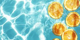 Orange Slices Floating in Clear Blue Water with Ripples and Sunlight Reflections