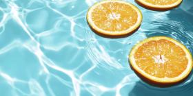 Orange Slices Floating in Clear Blue Water with Ripples and Sunlight Reflections