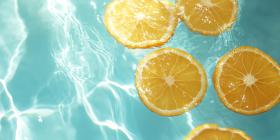 Orange Slices Floating in Clear Blue Water with Ripples and Sunlight Reflections