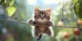 Cute Fluffy Kitten Hanging Onto Two Ropes with Bokeh Lights in the Background
