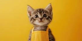 Kitten Wearing a Yellow Apron Against a Bright Yellow Background