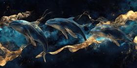 Two Whales Swimming in Abstract Dark Blue Sea with Gold Lines and Glittering Accents