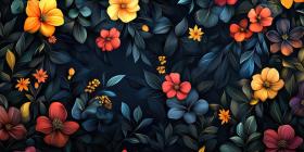 Floral Pattern with Dark Leaves and Vibrant Orange, Red, and Yellow Flowers on a Dark Background