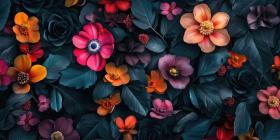 Floral Pattern with Dark Leaves and Vibrant Orange, Red, and Yellow Flowers on a Dark Background