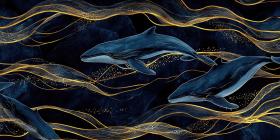 Two Whales Swimming in Abstract Dark Blue Sea with Gold Lines and Glittering Accents