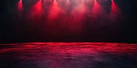 Empty Stage with Red Lights and Dark Curtains, Ready for a Performance