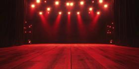 Empty Stage with Red Lights and Dark Curtains, Ready for a Performance