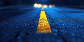 Close-up of a Yellow Line on a Dark Blue Asphalt Road at Night