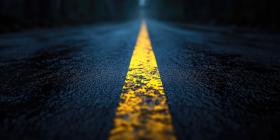Close-up of a Yellow Line on a Dark Blue Asphalt Road at Night