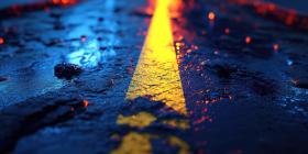 Close-up of a Yellow Line on a Dark Blue Asphalt Road at Night