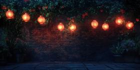 Dark Brick Wall with Glowing Lanterns Hanging Above, Rustic Outdoor Setting with Stone Floor