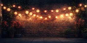 Dark Brick Wall with Glowing Lanterns Hanging Above, Rustic Outdoor Setting with Stone Floor