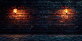 Dark Brick Wall with Glowing Lanterns Hanging Above, Rustic Outdoor Setting with Stone Floor