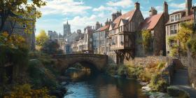 Old Stone Village with River, Bridge, and Lush Green Trees, Fairytale Landscape