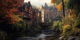Old Stone Village with River, Bridge, and Lush Green Trees, Fairytale Landscape