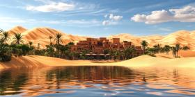 Luxury Desert Oasis with Palace, Palm Trees, and Blue Water Pool in Sunny Landscape