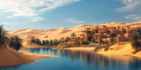 Luxury Desert Oasis with Palace, Palm Trees, and Blue Water Pool in Sunny Landscape
