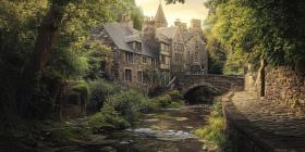 Old Stone Village with River, Bridge, and Lush Green Trees, Fairytale Landscape