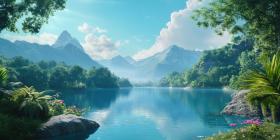 Tranquil Mountain Lake Surrounded by Lush Green Forest and Snow-Capped Peaks, Peaceful Nature Scene