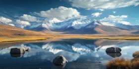 Tranquil Mountain Lake Surrounded by Lush Green Forest and Snow-Capped Peaks, Peaceful Nature Scene