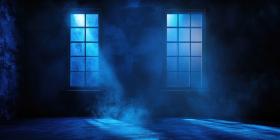 Sunlight Streaming Through a Gridded Window into a Dark, Empty Room with Dust Motes