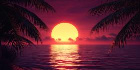 Tropical Beach Sunset with Palm Trees, Orange Sky, and Gentle Waves on the Shore