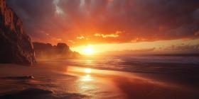 Tropical Beach Sunset with Palm Trees, Orange Sky, and Gentle Waves on the Shore